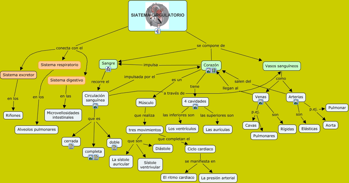 circulatorio, SIATEMA CIRCULATORIO conecta con el Sistema respiratorio, Circulación sanguínea que es completa, Circulación sanguínea impulsada por el Corazón, tres movimientos que son La sístole auricular, Sistema respiratorio en los Alveolos pulmonares, Sistema digestivo en las Microvellosidades intestinales, Venas son Rígidas, Arterias salen del Corazón, SIATEMA CIRCULATORIO conecta con el Sistema excretor, Sangre recorre el Circulación sanguínea