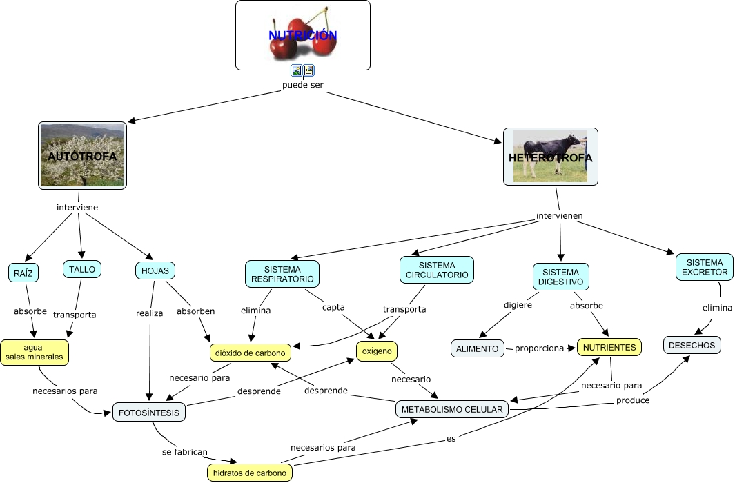 nutrición, agua sales minerales necesarios para FOTOSÍNTESIS, NUTRICIÓN puede ser AUTÓTROFA, FOTOSÍNTESIS desprende oxígeno, METABOLISMO CELULAR desprende dióxido de carbono, HETERÓTROFA intervienen SISTEMA RESPIRATORIO, AUTÓTROFA interviene RAÍZ, SISTEMA DIGESTIVO absorbe NUTRIENTES, NUTRIENTES necesario para METABOLISMO CELULAR, SISTEMA RESPIRATORIO elimina dióxido de carbono, TALLO transporta agua sales minerales