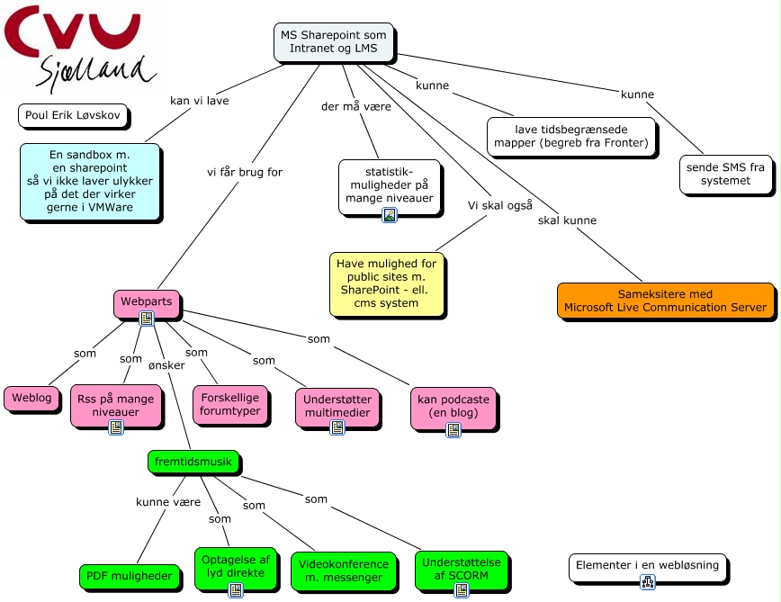 cvu-intra-lms-1, MS Sharepoint som Intranet og LMS kunne sende SMS fra systemet, MS Sharepoint som Intranet og LMS vi får brug for Webparts, Webparts som kan podcaste (en blog), MS Sharepoint som Intranet og LMS kan vi lave En sandbox m. en sharepoint så vi ikke laver ulykker på det der virker gerne i VMWare, MS Sharepoint som Intranet og LMS der må være statistik- muligheder på mange niveauer, MS Sharepoint som Intranet og LMS skal kunne Sameksitere med Microsoft Live Communication Server, fremtidsmusik som Videokonference m. messenger, fremtidsmusik som Optagelse af lyd direkte, Webparts som Weblog, fremtidsmusik som Understøttelse af SCORM