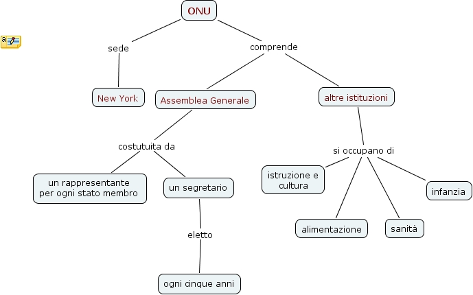 ONU2, altre istituzioni si occupano di alimentazione, un segretario eletto ogni cinque anni, ONU sede New York, altre istituzioni si occupano di infanzia, ONU comprende Assemblea Generale, Assemblea Generale costutuita da un rappresentante per ogni stato membro, altre istituzioni si occupano di sanità, ONU comprende altre istituzioni, altre istituzioni si occupano di istruzione e cultura, Assemblea Generale costutuita da un segretario