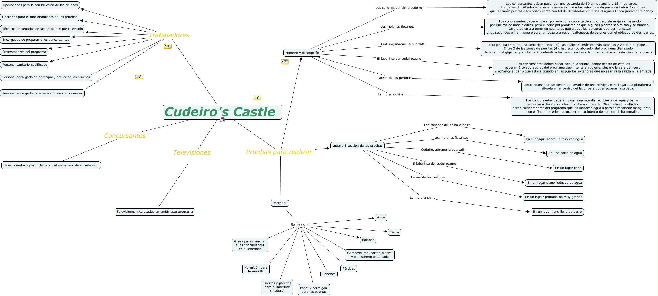 Cuderio Castle, Material Se necesita Hormigón para la muralla, Lugar / Situacion de las pruebas Los mojones flotantes En una balsa de agua, Material Se necesita Gomaespuma, carton-piedra y poliestireno expandido, Cudeiro's Castle Trabajadores Operarios para el funcionamiento de las pruebas, Material Se necesita Papel y hormigón para las puertas, Material Se necesita Cañones, Material Se necesita Puertas y paredes para el laberinto (madera), Cudeiro's Castle Trabajadores Personal sanitario cualificado, Nombre y descripción Los mojones flotantes Los concursantes deberan pasar por una zona cubierta de agua, pero sin mojarse, pasando por encima de unas piedras, pero el principal problema es que algunas piedras son falsas y se hunden. Otro problema a tener en cuenta es que a aquellas personas que permanezcan unos segundos en la misma piedra, empezará a recibir cañonazos de balones con el objetivo de derribarles., Nombre y descripción Los cañones del chino cudeiro Los concursantes deben pasar por una pasarela de 50 cm de ancho y 15 m de largo. Una de las dificultades a tener en cuenta es que a los lados de esta pasarela habrá 2 cañones que lanzarán pelotas a los concursante con tal de derribarlos y tirarlos al agua situada justamente debajo.