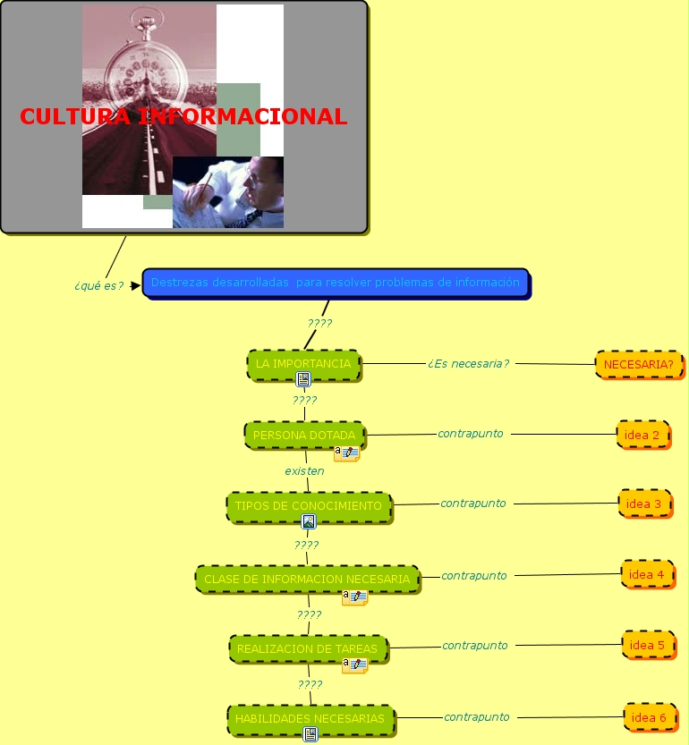 TAREA 1 CULTURA INFORMACIONAL, PERSONA DOTADA existen TIPOS DE CONOCIMIENTO, Destrezas desarrolladas para resolver problemas de información ???? LA IMPORTANCIA, REALIZACION DE TAREAS contrapunto idea 5, PERSONA DOTADA contrapunto idea 2, REALIZACION DE TAREAS ???? HABILIDADES NECESARIAS, CULTURA INFORMACIONAL ¿qué es? Destrezas desarrolladas para resolver problemas de información, TIPOS DE CONOCIMIENTO contrapunto idea 3, CLASE DE INFORMACION NECESARIA ???? REALIZACION DE TAREAS, CLASE DE INFORMACION NECESARIA contrapunto idea 4, HABILIDADES NECESARIAS contrapunto idea 6