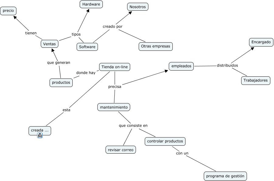 Proyecto, empleados distribuidos Trabajadores, Tienda on-line precisa mantenimiento, Tienda on-line precisa empleados, mantenimiento que consiste en revisar correo, mantenimiento que consiste en controlar productos, Ventas tienen precio, Tienda on-line esta creada ..., Tienda on-line donde hay productos, controlar productos con un programa de gestión, Ventas tipos Software