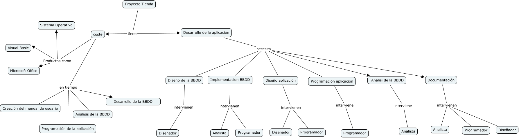 Proyecto, coste Productos como Sistema Operativo, Implementacion BBDD intervienen Programador, Desarrollo de la aplicación necesita Documentación, coste en tiempo Desarrollo de la BBDD, Documentación intervienen Diseñador, coste Productos como Microsoft Office, Programación aplicación interviene Programador, Diseño aplicación intervienen Diseñador, Proyecto Tienda tiene coste, Desarrollo de la aplicación necesita Diseño de la BBDD