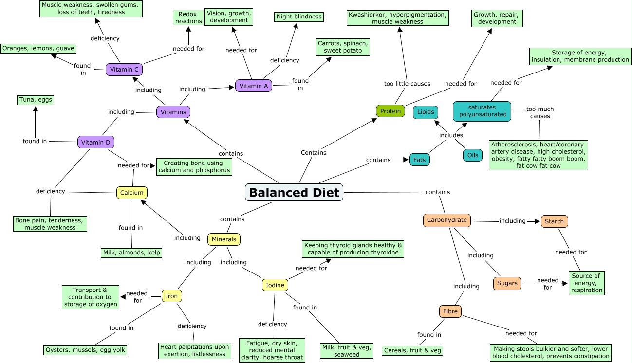 Balanced diet Jack Mao & Sagar, Sugars needed for Source of energy, respiration, Iodine needed for Keeping thyroid glands healthy & capable of producing thyroxine, Minerals including Iron, Fats includes saturates polyunsaturated, Fibre needed for Making stools bulkier and softer, lower blood cholesterol, prevents constipation, Vitamin A deficiency Night blindness, Vitamin A needed for Vision, growth, development, Vitamin C found in Oranges, lemons, guave, Balanced Diet contains Fats, Protein needed for Growth, repair, development
