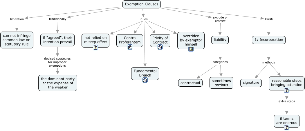 Exemption Clauses, Exemption Clauses rules Contra Proferentem, Exemption Clauses limitation can not infringe common law or statutory rule, liability categories sometimes tortious, 1: Incorporation methods signature, if "agreed", their intention prevail devised strategies for improper exemptions the dominant party at the expense of the weaker, 1: Incorporation methods reasonable steps bringing attention, Exemption Clauses rules Privity of Contract, reasonable steps bringing attention extra steps if terms are onerous, Exemption Clauses rules overriden by exemptor himself, Exemption Clauses traditionally if "agreed", their intention prevail