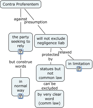 Contra Proferentem, Contra Proferentem against the party seeking to rely, will not exclude negligence liab relaxed in limitation, statues but not common law can be excluded by very clear word (comm law), Contra Proferentem presumption will not exclude negligence liab, the party seeking to rely but construe words in normal way, will not exclude negligence liab protected by statues but not common law