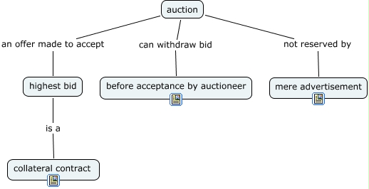 auctions, highest bid is a collateral contract, auction can withdraw bid before acceptance by auctioneer, auction not reserved by mere advertisement, auction an offer made to accept highest bid