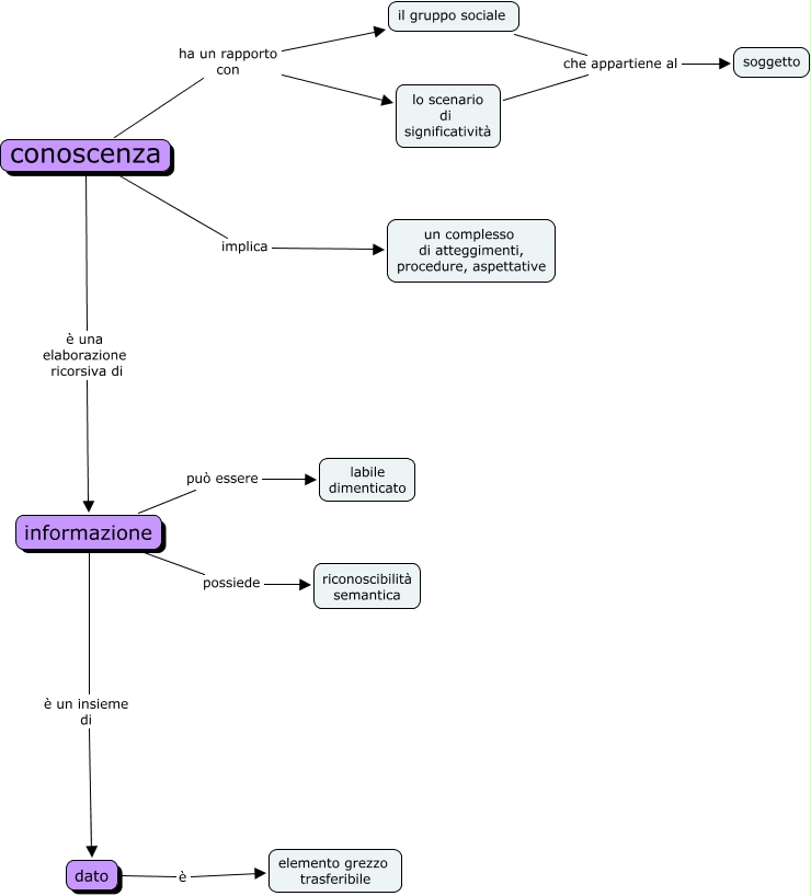 dati infromazione conoscenza, conoscenza implica un complesso di atteggimenti, procedure, aspettative, dato è elemento grezzo trasferibile, informazione può essere labile dimenticato, il gruppo sociale che appartiene al soggetto, conoscenza ha un rapporto con lo scenario di significatività, informazione possiede riconoscibilità semantica, conoscenza è una elaborazione ricorsiva di informazione, informazione è un insieme di dato, lo scenario di significatività che appartiene al soggetto, conoscenza ha un rapporto con il gruppo sociale