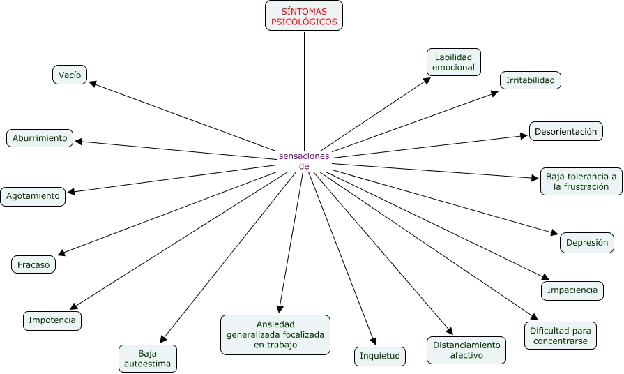 Síntomas Psicológicos, SÍNTOMAS PSICOLÓGICOS sensaciones de Inquietud, SÍNTOMAS PSICOLÓGICOS sensaciones de Distanciamiento afectivo, SÍNTOMAS PSICOLÓGICOS sensaciones de Labilidad emocional, SÍNTOMAS PSICOLÓGICOS sensaciones de Irritabilidad, SÍNTOMAS PSICOLÓGICOS sensaciones de Desorientación, SÍNTOMAS PSICOLÓGICOS sensaciones de Agotamiento, SÍNTOMAS PSICOLÓGICOS sensaciones de Impotencia, SÍNTOMAS PSICOLÓGICOS sensaciones de Ansiedad generalizada focalizada en trabajo, SÍNTOMAS PSICOLÓGICOS sensaciones de Depresión, SÍNTOMAS PSICOLÓGICOS sensaciones de Baja tolerancia a la frustración