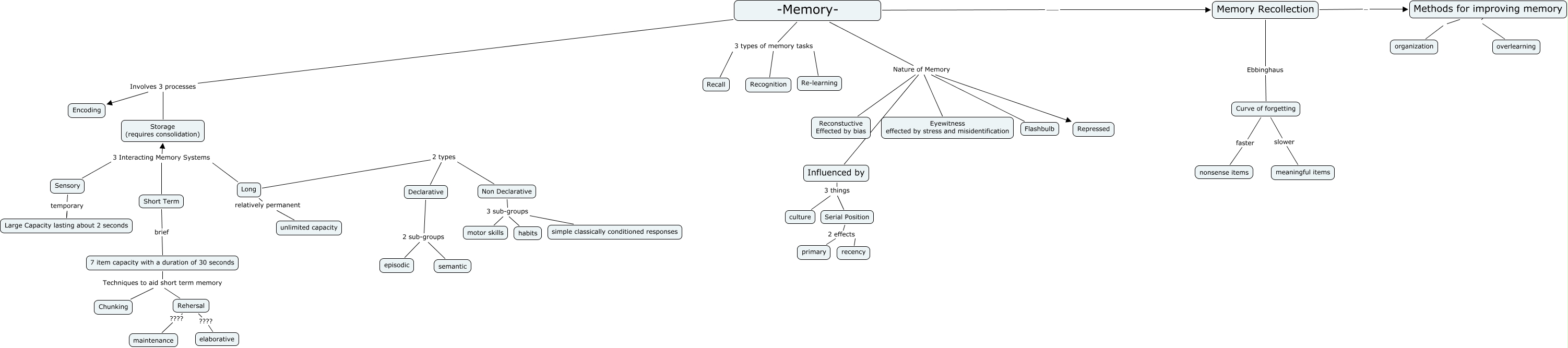 Chapter 6 William Thomas, -Memory- Nature of Memory Influenced by, Declarative 2 sub-groups episodic, Methods for improving memory organization, Short Term brief 7 item capacity with a duration of 30 seconds, Serial Position 2 effects primary, habits 3 sub-groups motor skills, Declarative 2 sub-groups semantic, Memory Recollection _ Methods for improving memory, Rehersal Techniques to aid short term memory Chunking, Flashbulb Nature of Memory Influenced by