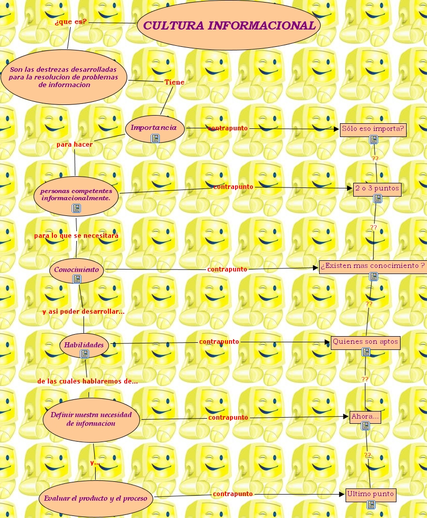 Definir nuestra necesidad de informacion y... Evaluar el producto y el proceso, Son las destrezas desarrolladas para la resolucion de problemas de informacion Tiene Importancia , CULTURA INFORMACIONAL �que es? Son las destrezas desarrolladas para la resolucion de problemas de informacion, Conocimiento contrapunto �Existen mas conocimiento ?, personas competentes informacionalmente. contrapunto 2 o 3 puntos, Importancia contrapunto S�lo eso importa?, Habilidades de las cuales hablaremos de... Definir nuestra necesidad de informacion, Conocimiento y asi poder desarrollar... Habilidades, 2 o 3 puntos ?? �Existen mas conocimiento ?, �Existen mas conocimiento ? ?? Quienes son aptos, Ahora... ?? Ultimo punto, Habilidades contrapunto Quienes son aptos, personas competentes informacionalmente. para lo que se necesitar� Conocimiento, Definir nuestra necesidad de informacion contrapunto Ahora..., Evaluar el producto y el proceso contrapunto Ultimo punto, Quienes son aptos ?? Ahora..., Importancia para hacer personas competentes informacionalmente., S�lo eso importa? ?? 2 o 3 puntos