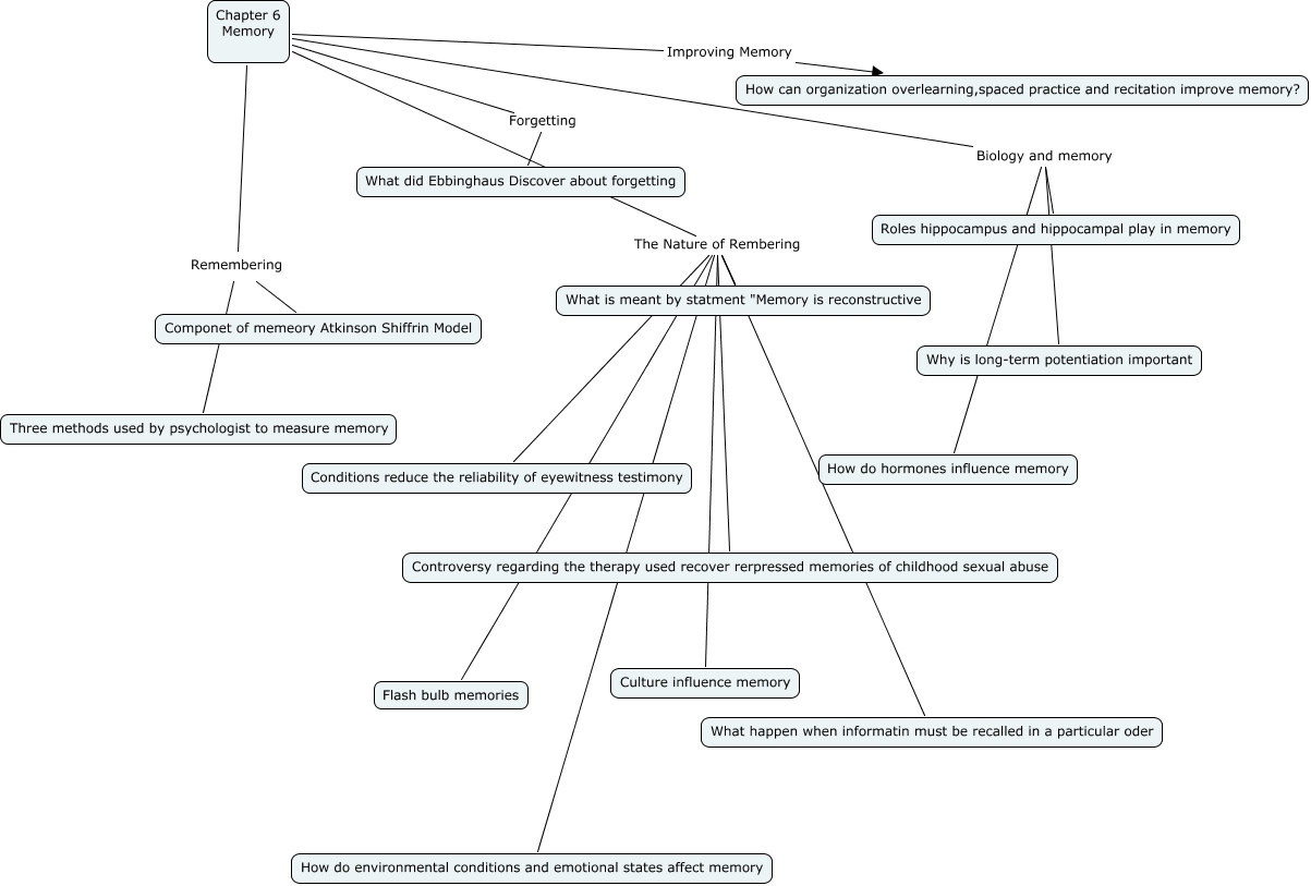 Chapter 6 Deborah Fletcher, Chapter 6 Memory Forgetting What did Ebbinghaus Discover about forgetting, Chapter 6 Memory Biology and memory Roles hippocampus and hippocampal play in memory, Chapter 6 Memory The Nature of Rembering Controversy regarding the therapy used recover rerpressed memories of childhood sexual abuse, Chapter 6 Memory Remembering Componet of memeory Atkinson Shiffrin Model, Chapter 6 Memory Biology and memory Why is long-term potentiation important, Chapter 6 Memory Improving Memory How can organization overlearning,spaced practice and recitation improve memory?, Chapter 6 Memory The Nature of Rembering How do environmental conditions and emotional states affect memory, Chapter 6 Memory Remembering Three methods used by psychologist to measure memory, Chapter 6 Memory The Nature of Rembering Conditions reduce the reliability of eyewitness testimony, Chapter 6 Memory The Nature of Rembering What happen when informatin must be recalled in a particular oder