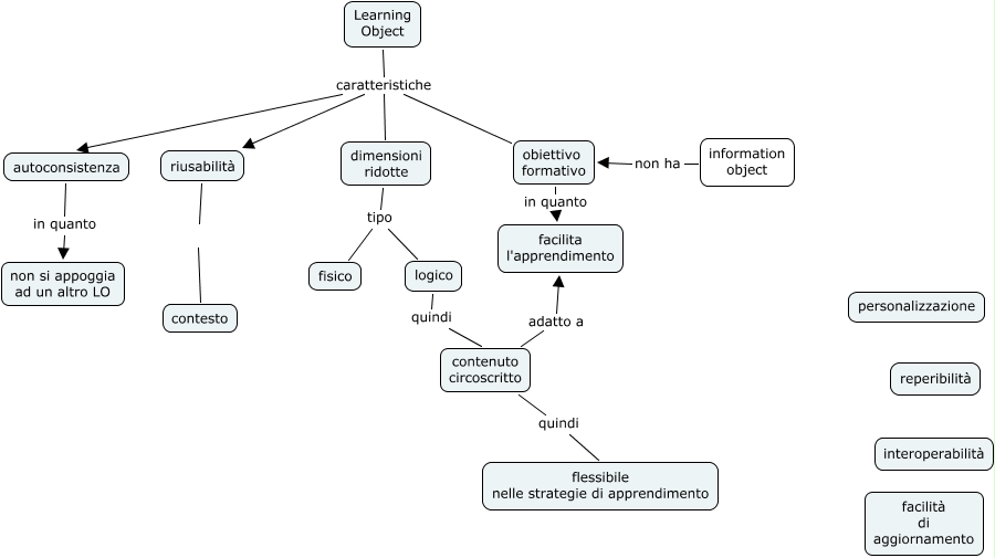 LO caratteristiche, Learning Object caratteristiche riusabilità, dimensioni ridotte tipo logico, Learning Object caratteristiche dimensioni ridotte, autoconsistenza in quanto non si appoggia ad un altro LO, Learning Object caratteristiche autoconsistenza, riusabilità contesto, logico quindi contenuto circoscritto, obiettivo formativo in quanto facilita l'apprendimento, Learning Object caratteristiche obiettivo formativo, contenuto circoscritto quindi flessibile nelle strategie di apprendimento
