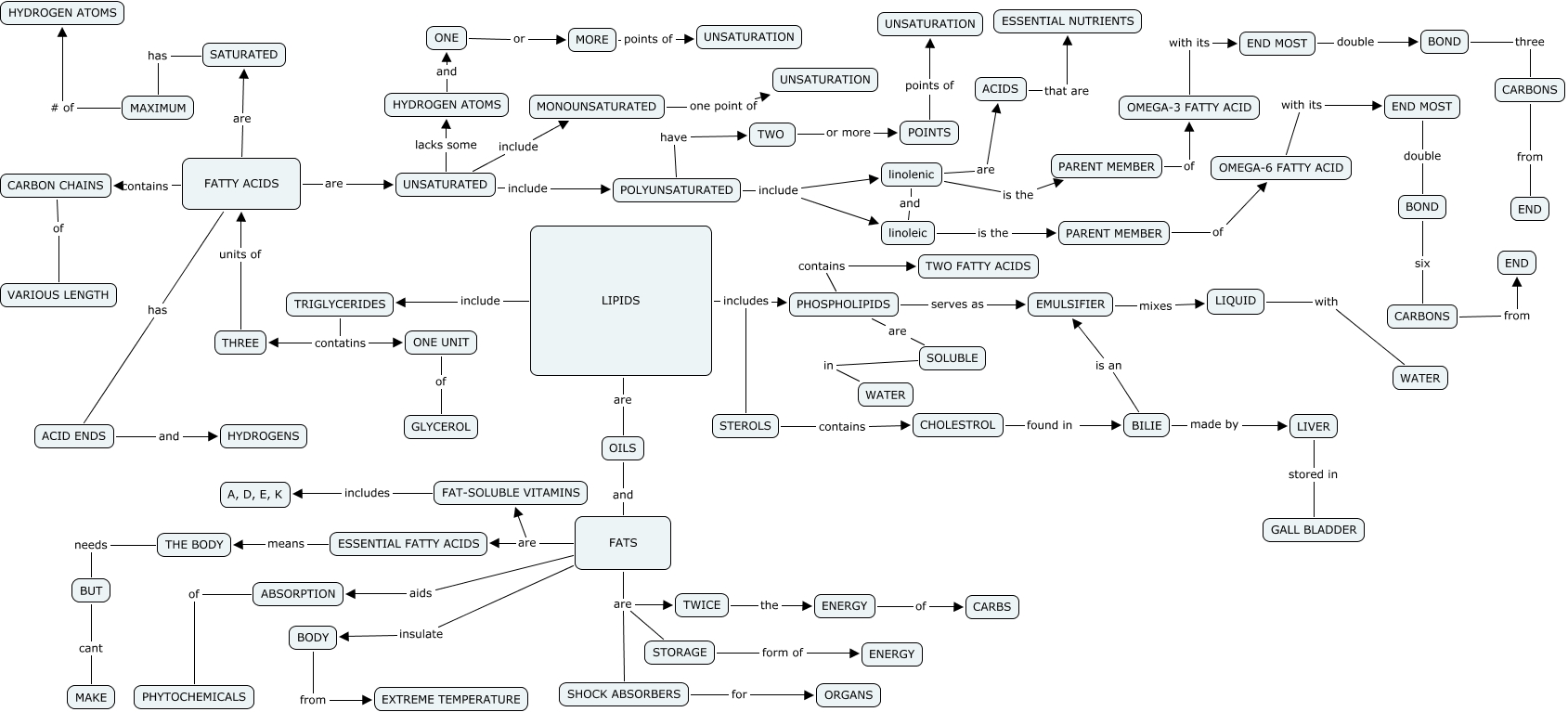 lipids, UNSATURATED include POLYUNSATURATED, THREE units of FATTY ACIDS, OMEGA-3 FATTY ACID with its END MOST, ENERGY of CARBS, linolenic are ACIDS, MAXIMUM # of HYDROGEN ATOMS, FAT-SOLUBLE VITAMINS includes A, D, E, K, SHOCK ABSORBERS for ORGANS, OMEGA-6 FATTY ACID with its END MOST, STEROLS contains CHOLESTROL