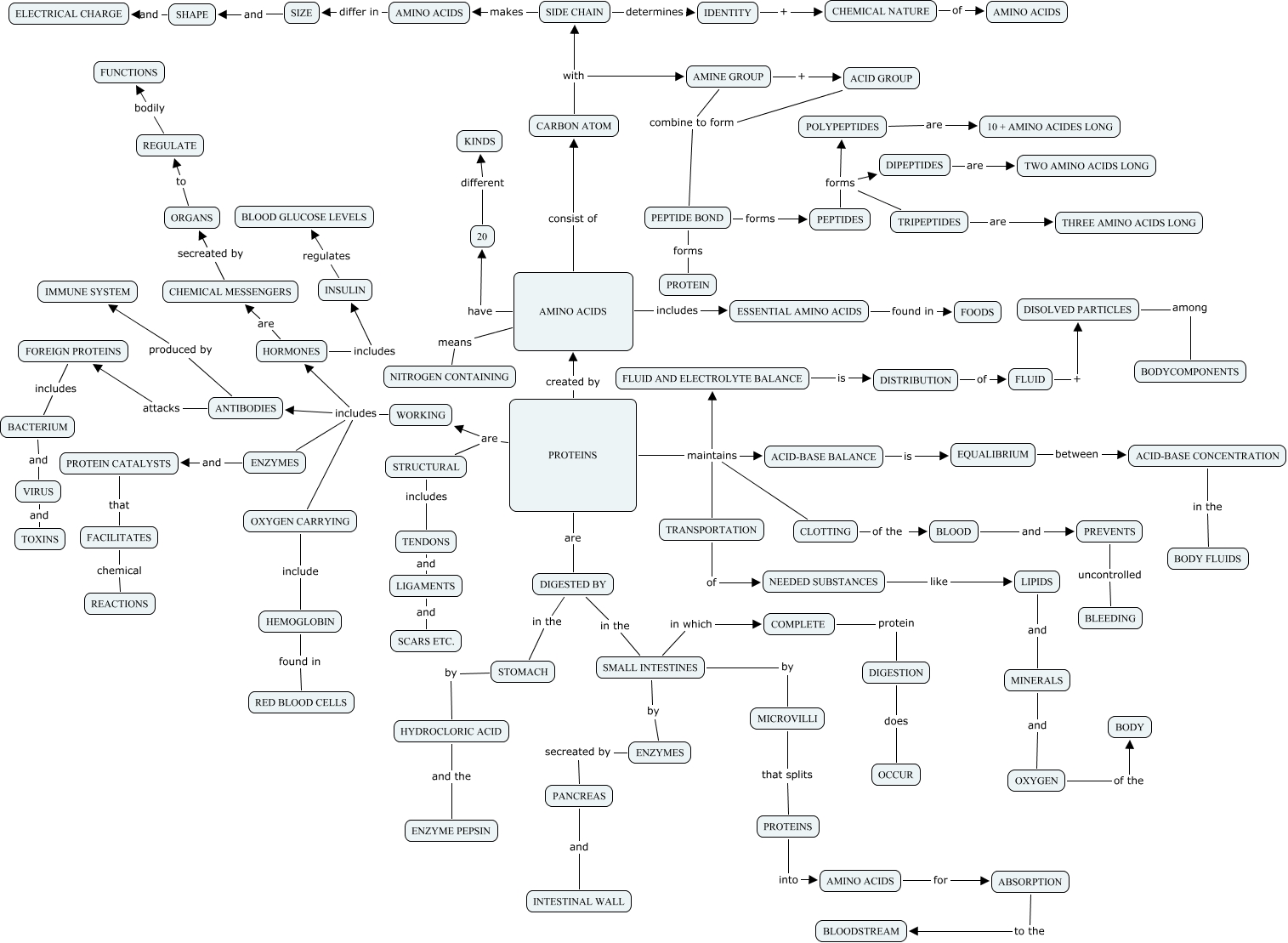 proteins, SMALL INTESTINES by MICROVILLI, AMINO ACIDS consist of CARBON ATOM, PEPTIDE BOND forms PEPTIDES, PROTEIN CATALYSTS that FACILITATES, PANCREAS and INTESTINAL WALL, TENDONS and LIGAMENTS, PROTEINS into AMINO ACIDS, FACILITATES chemical REACTIONS, HYDROCLORIC ACID and the ENZYME PEPSIN, WORKING includes ENZYMES