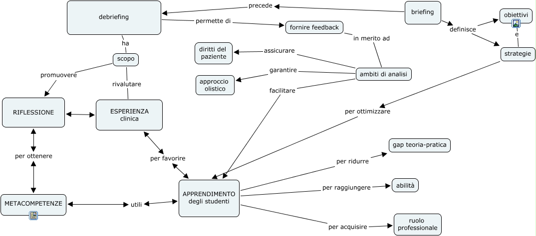 debriefing2, APPRENDIMENTO degli studenti per raggiungere abilità, debriefing permette di fornire feedback, briefing definisce obiettivi, ambiti di analisi facilitare APPRENDIMENTO degli studenti, RIFLESSIONE per ottenere METACOMPETENZE, APPRENDIMENTO degli studenti per ridurre gap teoria-pratica, scopo promuovere RIFLESSIONE, ESPERIENZA clinica per favorire APPRENDIMENTO degli studenti, briefing definisce strategie, strategie per ottimizzare APPRENDIMENTO degli studenti
