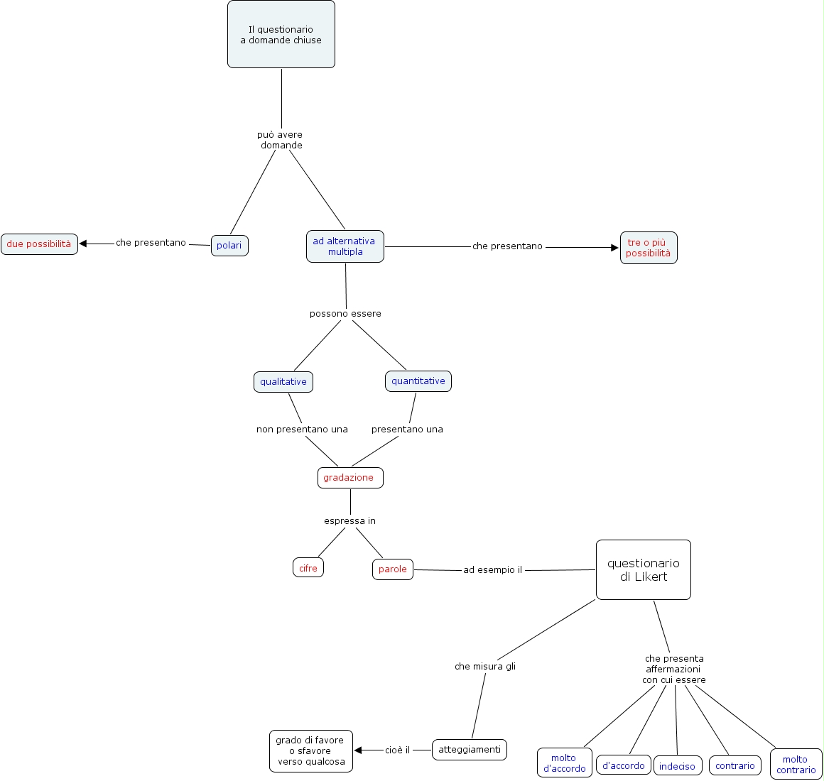 questionario a domande chiuse, ad alternativa multipla possono essere quantitative, Il questionario a domande chiuse può avere domande polari, questionario di Likert che presenta affermazioni con cui essere indeciso, qualitative non presentano una gradazione, ad alternativa multipla possono essere quantitative, questionario di Likert che presenta affermazioni con cui essere molto d'accordo, gradazione espressa in cifre, questionario di Likert che presenta affermazioni con cui essere contrario, polari che presentano due possibilità, atteggiamenti cioè il grado di favore o sfavore verso qualcosa