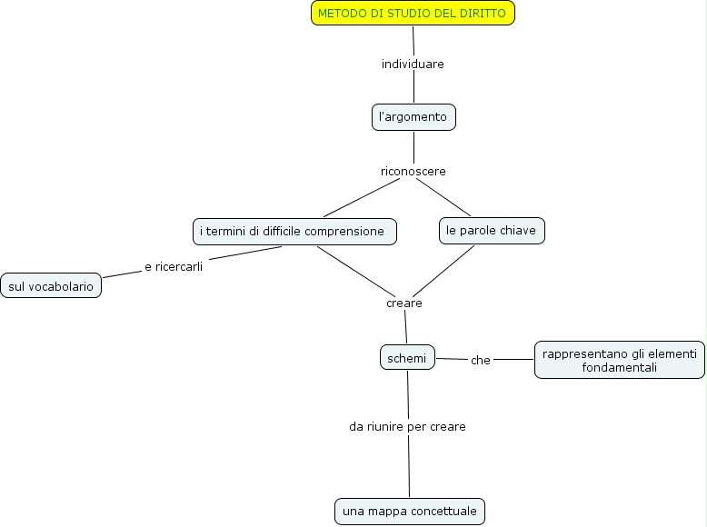 METODO DI STUDIO, schemi da riunire per creare una mappa concettuale, le parole chiave riconoscere l'argomento, l'argomento individuare METODO DI STUDIO DEL DIRITTO, sul vocabolario e ricercarli i termini di difficile comprensione, i termini di difficile comprensione riconoscere l'argomento, i termini di difficile comprensione creare schemi, schemi che rappresentano gli elementi fondamentali, le parole chiave creare schemi