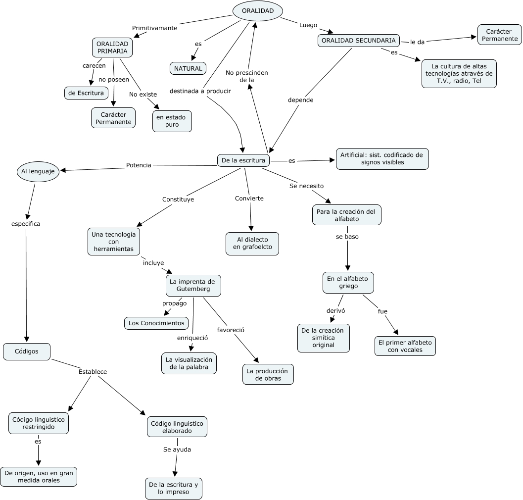 Ong, ORALIDAD PRIMARIA carecen de Escritura, Una tecnología con herramientas incluye La imprenta de Gutemberg, La imprenta de Gutemberg propago Los Conocimientos, ORALIDAD PRIMARIA No existe en estado puro, De la escritura Se necesito Para la creación del alfabeto, Al lenguaje especifica Códigos, De la escritura es Artificial: sist. codificado de signos visibles, De la escritura Convierte Al dialecto en grafoelcto, ORALIDAD destinada a producir De la escritura, Códigos Establece Código linguistico elaborado