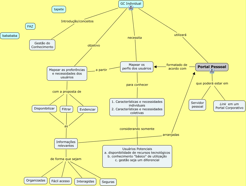 GC-Individual, GC Individual objetivo Mapear as preferências e necessidades dos usuários, Mapear as preferências e necessidades dos usuários com a proposta de Evidenciar, Evidenciar as Informações relevantes, Informações relevantes de forma que sejam Fácil acesso, Informações relevantes de forma que sejam Interagidas, Disponibilizar as Informações relevantes, Filtrar as Informações relevantes, Mapear os perfis dos usuários para conhecer 1. Características e necessidades individuais 2. Características e necessidades coletivas, Informações relevantes de forma que sejam Seguras, GC Individual Introdução/conceitos Gestão do Conhecimento