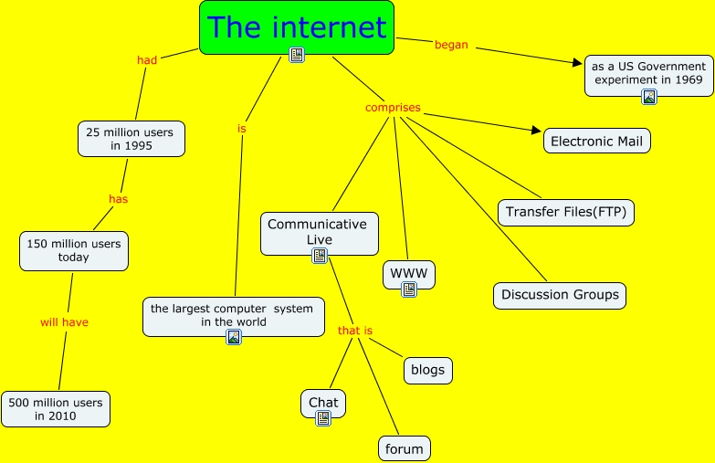 Este Cmap, tiene información relacionada con: nuova internet map, 150 million users today will have 500 million users in 2010, The internet comprises Electronic Mail, Communicative Live that is forum, The internet comprises Communicative Live, The internet comprises Transfer Files(FTP), Communicative Live that is blogs, The internet is the largest computer system in the world, Communicative Live that is Chat, 25 million users in 1995 has 150 million users today, The internet began as a US Government experiment in 1969, The internet had 25 million users in 1995, The internet comprises Discussion Groups, The internet comprises WWW