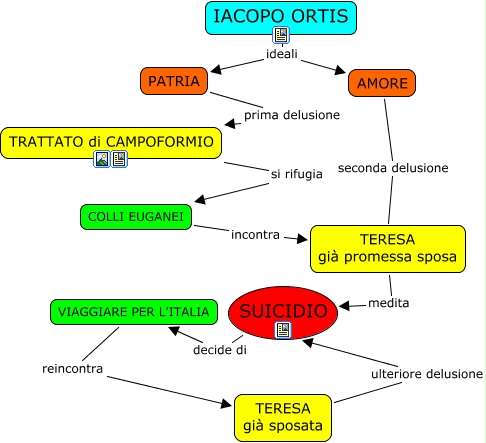 JACOPO ORTIS, TERESA già sposata ulteriore delusione SUICIDIO, AMORE seconda delusione TERESA già promessa sposa, COLLI EUGANEI incontra TERESA già promessa sposa, TERESA già promessa sposa medita SUICIDIO, IACOPO ORTIS ideali AMORE, VIAGGIARE PER L'ITALIA reincontra TERESA già sposata, SUICIDIO decide di VIAGGIARE PER L'ITALIA, PATRIA prima delusione TRATTATO di CAMPOFORMIO, IACOPO ORTIS ideali PATRIA, TRATTATO di CAMPOFORMIO si rifugia COLLI EUGANEI
