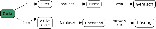 Gemisch Lösung, Aktiv- kohle farbloser Überstand, Filter braunes Filtrat, Filtrat kein Gemisch, Cola in Filter, Cola über Aktiv- kohle, Überstand Hinweis auf Lösung