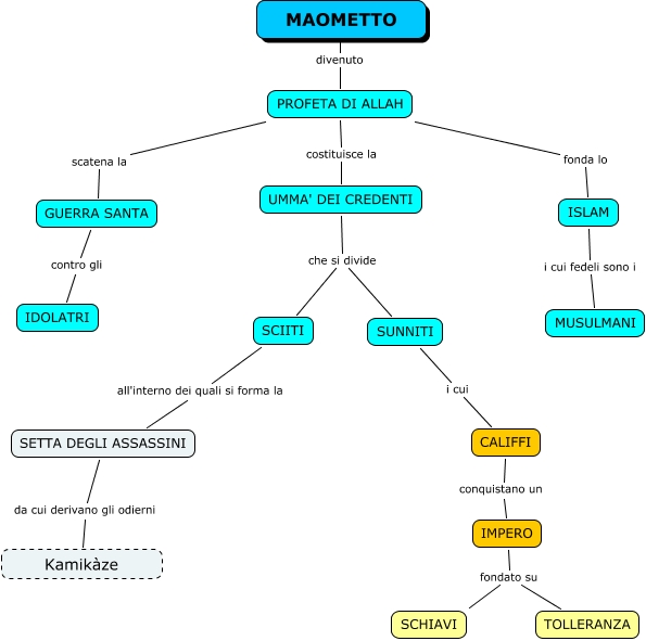 islam, UMMA' DEI CREDENTI che si divide SCIITI, UMMA' DEI CREDENTI che si divide SUNNITI, IMPERO fondato su TOLLERANZA, PROFETA DI ALLAH fonda lo ISLAM, SCIITI all'interno dei quali si forma la SETTA DEGLI ASSASSINI, CALIFFI conquistano un IMPERO, MAOMETTO divenuto PROFETA DI ALLAH, PROFETA DI ALLAH scatena la GUERRA SANTA, PROFETA DI ALLAH costituisce la UMMA' DEI CREDENTI, IMPERO fondato su SCHIAVI