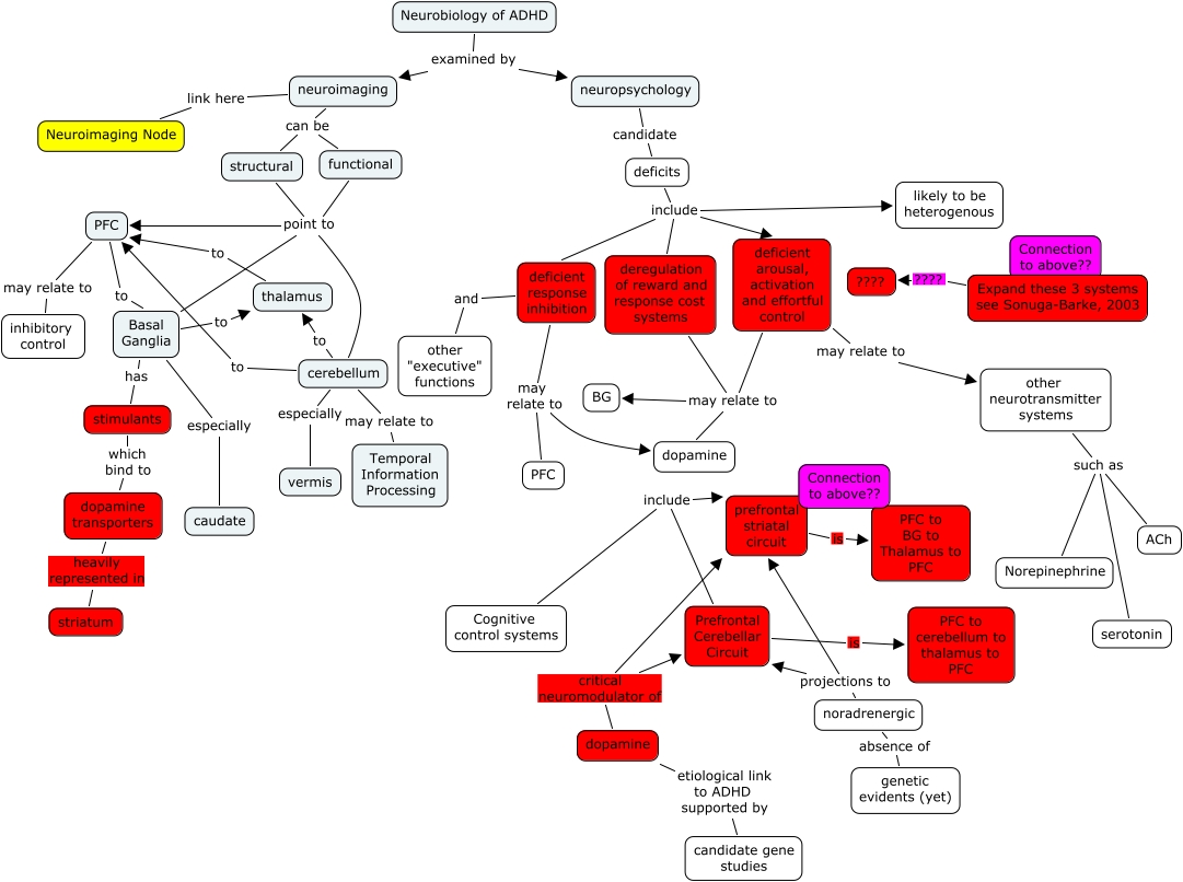 ADHD Neurobiology - JDN Rev, dopamine critical neuromodulator of prefrontal striatal circuit, cerebellum to PFC, functional point to PFC, dopamine etiological link to ADHD supported by candidate gene studies, functional point to PFC, neuroimaging can be structural, Basal Ganglia to thalamus, deficient response inhibition may relate to dopamine, deregulation of reward and response cost systems may relate to dopamine, Basal Ganglia especially caudate