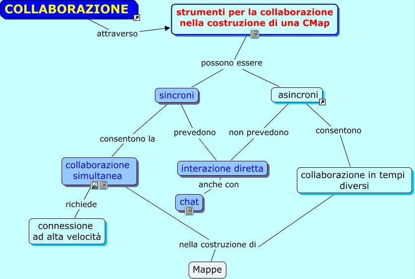 collaborazione_Cmap_3, interazione diretta anche con chat, COLLABORAZIONE attraverso strumenti per la collaborazione nella costruzione di una CMap, collaborazione simultanea nella costruzione di Mappe, asincroni non prevedono interazione diretta, collaborazione simultanea richiede connessione ad alta velocità, sincroni consentono la collaborazione simultanea, strumenti per la collaborazione nella costruzione di una CMap possono essere asincroni, collaborazione in tempi diversi nella costruzione di Mappe, asincroni consentono collaborazione in tempi diversi, strumenti per la collaborazione nella costruzione di una CMap possono essere sincroni