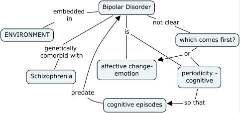 BD phenomenology - JDN Rev, Bipolar Disorder not clear which comes first?, periodicity - cognitive so that cognitive episodes, cognitive episodes predate Bipolar Disorder, which comes first? or affective change- emotion, Bipolar Disorder is periodicity - cognitive, which comes first? or periodicity - cognitive, Bipolar Disorder genetically comorbid with Schizophrenia, Bipolar Disorder is affective change- emotion, Bipolar Disorder embedded in ENVIRONMENT