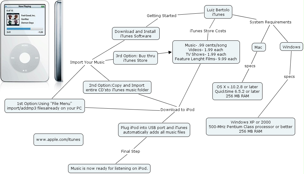 cmap 2 (iPod), Luiz Bertolo iTunes Getting Started Download and Install iTunes Software, 1st Option:Using "File Menu" import/addmp3 filesalready on your PC Download to iPod Plug iPod into USB port and iTunes automatically adds all music files, Download and Install iTunes Software Import Your Music 1st Option:Using "File Menu" import/addmp3 filesalready on your PC, Luiz Bertolo iTunes System Requirements Mac, 2nd Option:Copy and Import entire CD'sto iTunes music folder Download to iPod Plug iPod into USB port and iTunes automatically adds all music files, Download and Install iTunes Software Import Your Music 2nd Option:Copy and Import entire CD'sto iTunes music folder, Luiz Bertolo iTunes System Requirements Windows, Luiz Bertolo iTunes iTunes Store Costs Music- .99 cents/song Videos- 1.99 each TV Shows- 1.99 each Feature Lenght Films- 9.99 each, Plug iPod into USB port and iTunes automatically adds all music files Final Step Music is now ready for listening on iPod., Download and Install iTunes Software Import Your Music Music- .99 cents/song Videos- 1.99 each TV Shows- 1.99 each Feature Lenght Films- 9.99 each