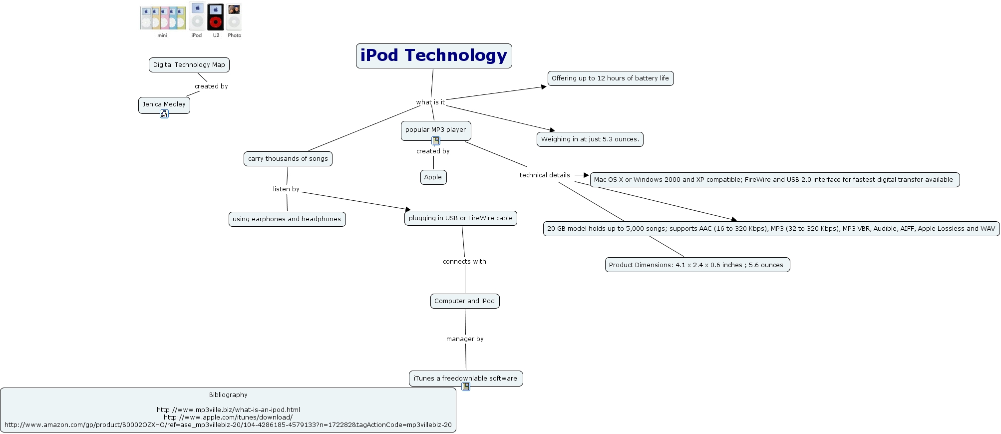 Technology map, carry thousands of songs listen by using earphones and headphones, popular MP3 player technical details 20 GB model holds up to 5,000 songs; supports AAC (16 to 320 Kbps), MP3 (32 to 320 Kbps), MP3 VBR, Audible, AIFF, Apple Lossless and WAV, plugging in USB or FireWire cable connects with Computer and iPod, Digital Technology Map created by Jenica Medley, popular MP3 player technical details Product Dimensions: 4.1 x 2.4 x 0.6 inches ; 5.6 ounces, Computer and iPod manager by iTunes a freedownlable software, iPod Technology what is it carry thousands of songs, popular MP3 player technical details Mac OS X or Windows 2000 and XP compatible; FireWire and USB 2.0 interface for fastest digital transfer available, popular MP3 player created by Apple, carry thousands of songs listen by plugging in USB or FireWire cable