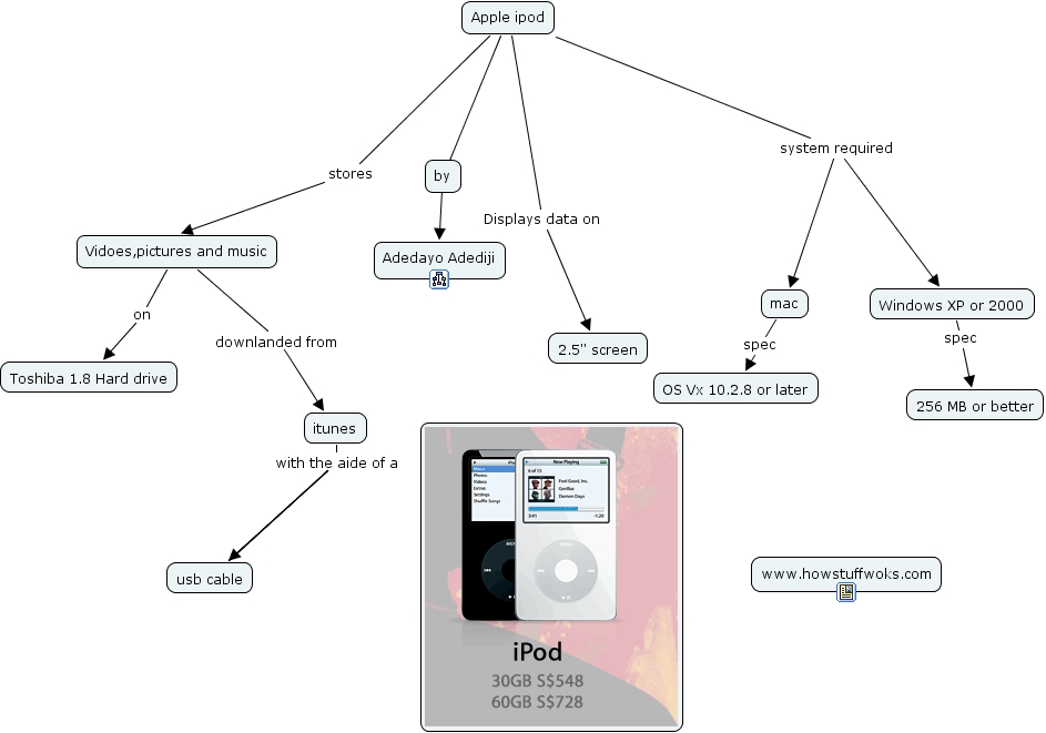 ipod, Vidoes,pictures and music on Toshiba 1.8 Hard drive, Apple ipod Displays data on 2.5'' screen, itunes with the aide of a usb cable, Vidoes,pictures and music downlanded from itunes, mac spec OS Vx 10.2.8 or later, Apple ipod stores Vidoes,pictures and music, Apple ipod system required mac, Apple ipod system required Windows XP or 2000, Apple ipod ???? Adedayo Adediji, Windows XP or 2000 spec 256 MB or better