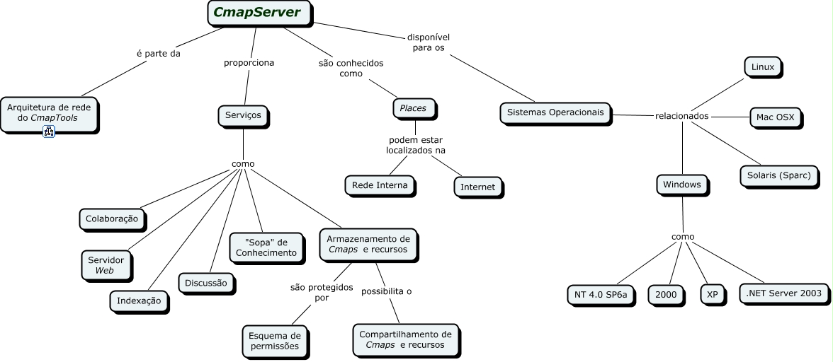 Apresentação CmapServer, Serviços como Indexação, Armazenamento de Cmaps e recursos possibilita o Compartilhamento de Cmaps e recursos, Windows como 2000, Sistemas Operacionais relacionados Windows, Places podem estar localizados na Internet, Windows como NT 4.0 SP6a, Serviços como "Sopa" de Conhecimento, Serviços como Servidor Web, Windows como XP, CmapServer disponível para os Sistemas Operacionais