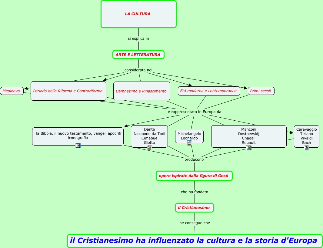 Gesù nell'arte, Medioevo è rappresentato in Europa da Michelangelo Leonardo, Primi secoli è rappresentato in Europa da la Bibbia, il nuovo testamento, vangeli apocrifi iconografia, Dante Jacopone da Todi Cimabue Giotto producono opere ispirate dalla figura di Gesù, Medioevo è rappresentato in Europa da Dante Jacopone da Todi Cimabue Giotto, ARTE E LETTERATURA considerata nel Età moderna e contemporanea, Periodo della Riforma e Controriforma è rappresentato in Europa da Dante Jacopone da Todi Cimabue Giotto, Caravaggio Tiziano Vivaldi Bach producono opere ispirate dalla figura di Gesù, Primi secoli è rappresentato in Europa da Caravaggio Tiziano Vivaldi Bach, Età moderna e contemporanea è rappresentato in Europa da Manzoni Dostoevskij Chagall Rouault, Uamnesimo e Rinascimento è rappresentato in Europa da la Bibbia, il nuovo testamento, vangeli apocrifi iconografia