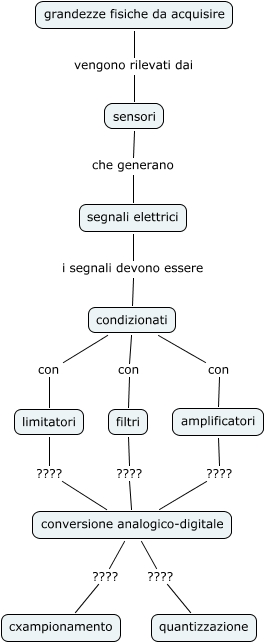 Catena di acquisizione, conversione analogico-digitale ???? quantizzazione, filtri ???? conversione analogico-digitale, amplificatori ???? conversione analogico-digitale, segnali elettrici i segnali devono essere condizionati, conversione analogico-digitale ???? cxampionamento, limitatori ???? conversione analogico-digitale, condizionati con limitatori, condizionati con filtri, sensori che generano segnali elettrici, grandezze fisiche da acquisire vengono rilevati dai sensori