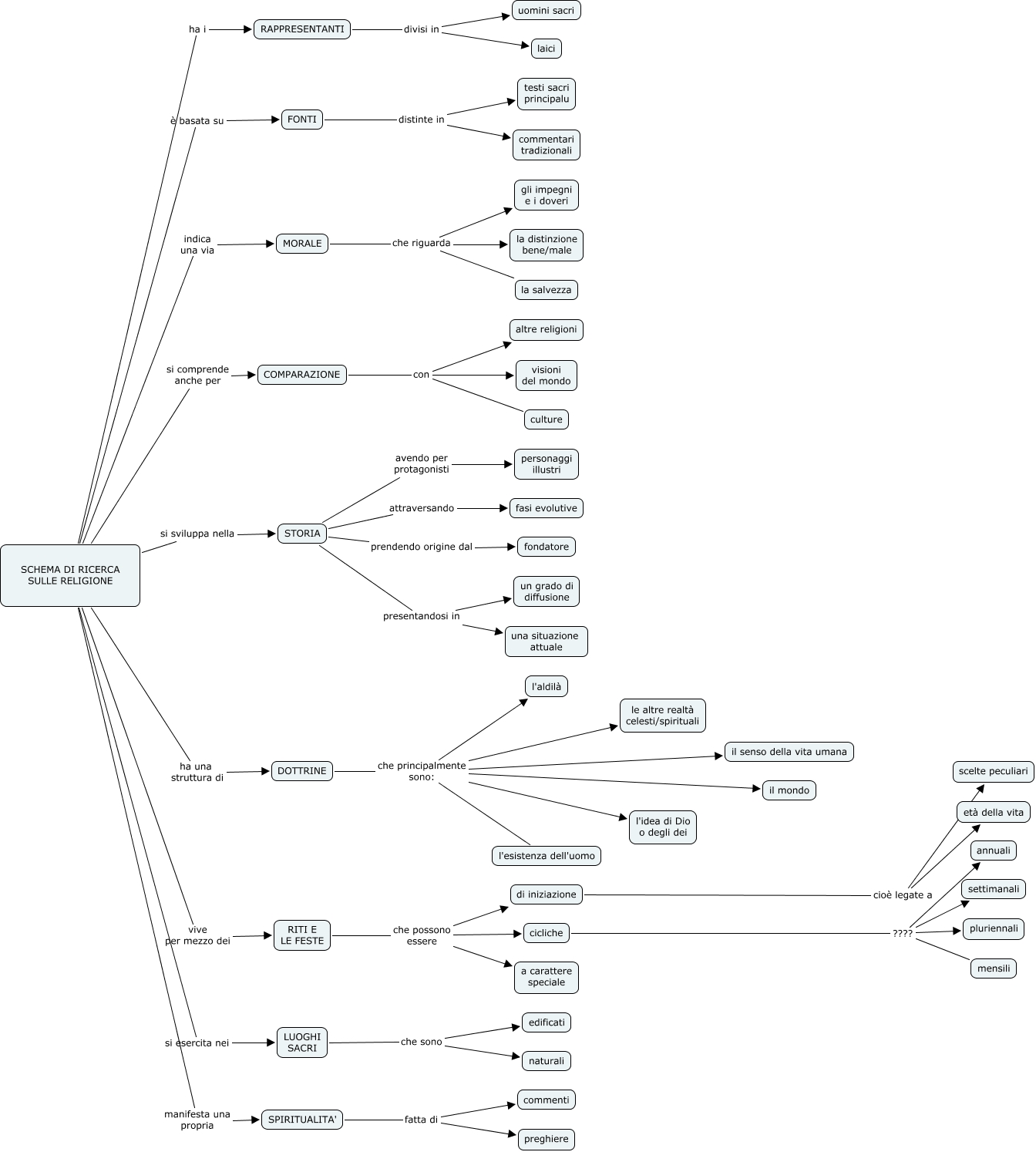 aspetti_religione2b, FONTI distinte in testi sacri principalu, SCHEMA DI RICERCA SULLE RELIGIONE ha i RAPPRESENTANTI, SCHEMA DI RICERCA SULLE RELIGIONE ha una struttura di DOTTRINE, RITI E LE FESTE che possono essere a carattere speciale, FONTI distinte in commentari tradizionali, MORALE che riguarda la distinzione bene/male, RAPPRESENTANTI divisi in uomini sacri, DOTTRINE che principalmente sono: l'idea di Dio o degli dei, cicliche ???? mensili, cicliche ???? settimanali