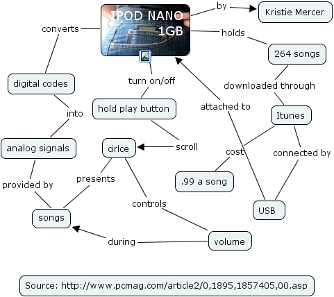 kristieCmap2, digital codes into analog signals, analog signals provided by songs, IPOD NANO 1GB by Kristie Mercer, IPOD NANO 1GB turn on/off hold play button, IPOD NANO 1GB turn on/off hold play button, cirlce controls volume, hold play button scroll cirlce, Itunes cost .99 a song, cirlce presents songs, Itunes connected by USB