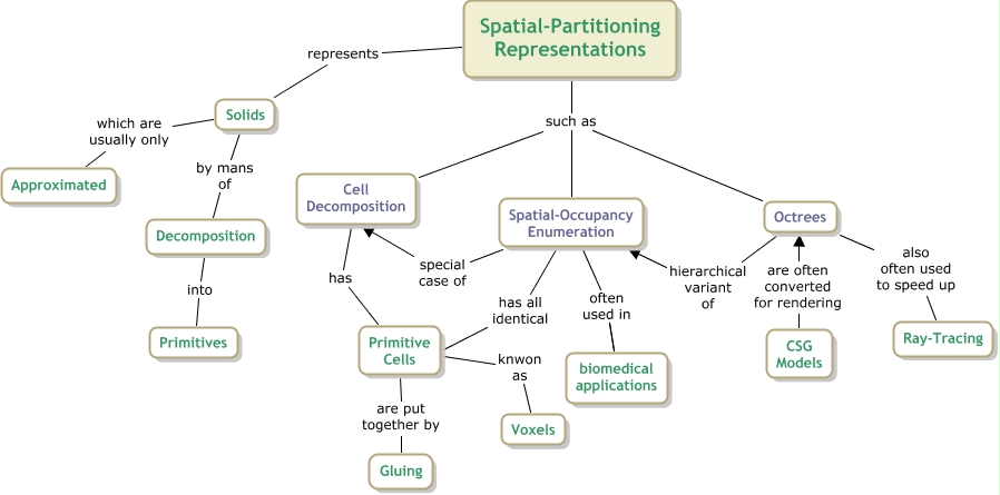 2006-03-23 Spatial Partitioning Representations, Spatial-Partitioning Representations such as Octrees, Spatial-Partitioning Representations such as Spatial-Occupancy Enumeration, Primitive Cells knwon as Voxels, Octrees also often used to speed up Ray-Tracing, Spatial-Partitioning Representations such as Cell Decomposition, CSG Models are often converted for rendering Octrees, Spatial-Occupancy Enumeration has all identical Primitive Cells, Solids by mans of Decomposition, Spatial-Occupancy Enumeration special case of Cell Decomposition, Spatial-Occupancy Enumeration often used in biomedical applications