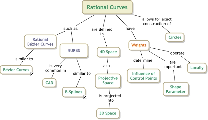 2006-03-13 Rational Curves, Weights are important Shape Parameter, Weights operate Locally, 4D Space aka Projective Space, Rational Curves have Weights, Rational Curves such as NURBS, Rational Curves are defined in 4D Space, Rational Curves allows for exact construction of Circles, NURBS similar to B-Splines, Weights determine Influence of Control Points, Projective Space is projected into 3D Space