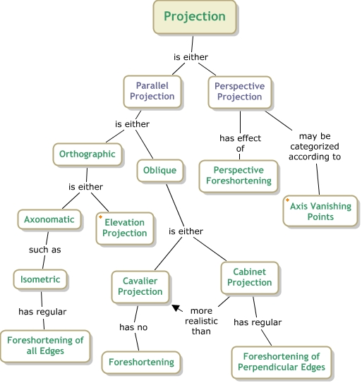2006-03-16 Projections, Cavalier Projection has no Foreshortening, Axonomatic such as Isometric, Isometric has regular Foreshortening of all Edges, Cabinet Projection has regular Foreshortening of Perpendicular Edges, Projection is either Perspective Projection, Orthographic is either Axonomatic, Parallel Projection is either Orthographic, Oblique is either Cavalier Projection, Perspective Projection may be categorized according to Axis Vanishing Points, Parallel Projection is either Oblique