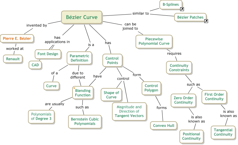 2006-03-12 Bezier Curves, B-Splines similar to Bézier Patches, First Order Continuity is also known as Tangential Continuity, Bézier Curve is a Parametric Definition, Control Points control Shape of Curve, Blending Function are usually Polynomials of Degree 3, Pierre E. Bézier worked at Renault, Zero Order Continuity is also known as Positional Continuity, Control Points form Control Polygon, Bézier Curve can be joined to Piecewise Polynomial Curve, Bézier Curve has applications in CAD