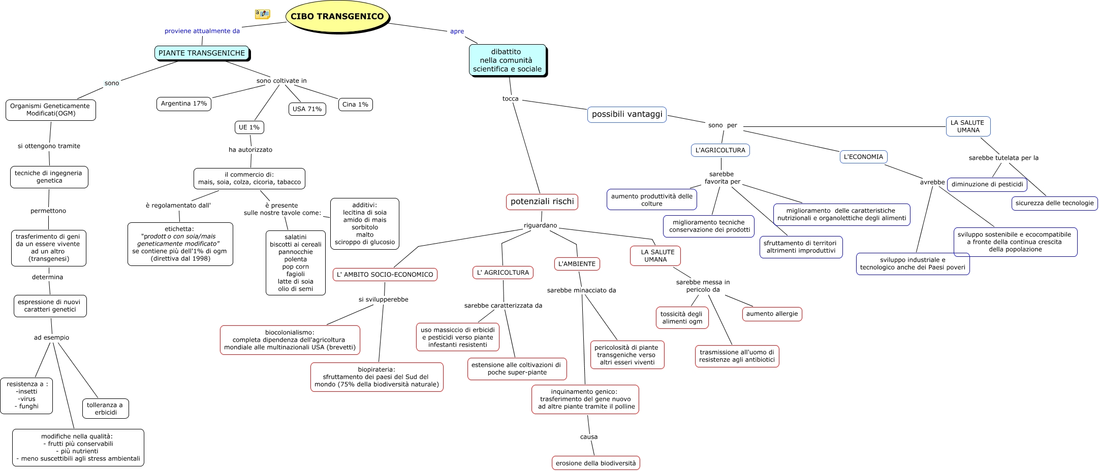 Cibo del futuro, possibili vantaggi sono per LA SALUTE UMANA, L'AMBIENTE sarebbe minacciato da pericolosità di piante transgeniche verso altri esseri viventi, dibattito nella comunità scientifica e sociale tocca potenziali rischi, trasferimento di geni da un essere vivente ad un altro (transgenesi) determina espressione di nuovi caratteri genetici, L'ECONOMIA avrebbe sviluppo industriale e tecnologico anche dei Paesi poveri, CIBO TRANSGENICO apre dibattito nella comunità scientifica e sociale, inquinamento genico: trasferimento del gene nuovo ad altre piante tramite il polline causa erosione della biodiversità, L'AGRICOLTURA sarebbe favorita per aumento produttività delle colture, LA SALUTE UMANA sarebbe messa in pericolo da trasmissione all'uomo di resistenze agli antibiotici, il commercio di: mais, soia, colza, cicoria, tabacco è presente sulle nostre tavole come: salatini biscotti ai cereali pannocchie polenta pop corn fagioli latte di soia olio di semi