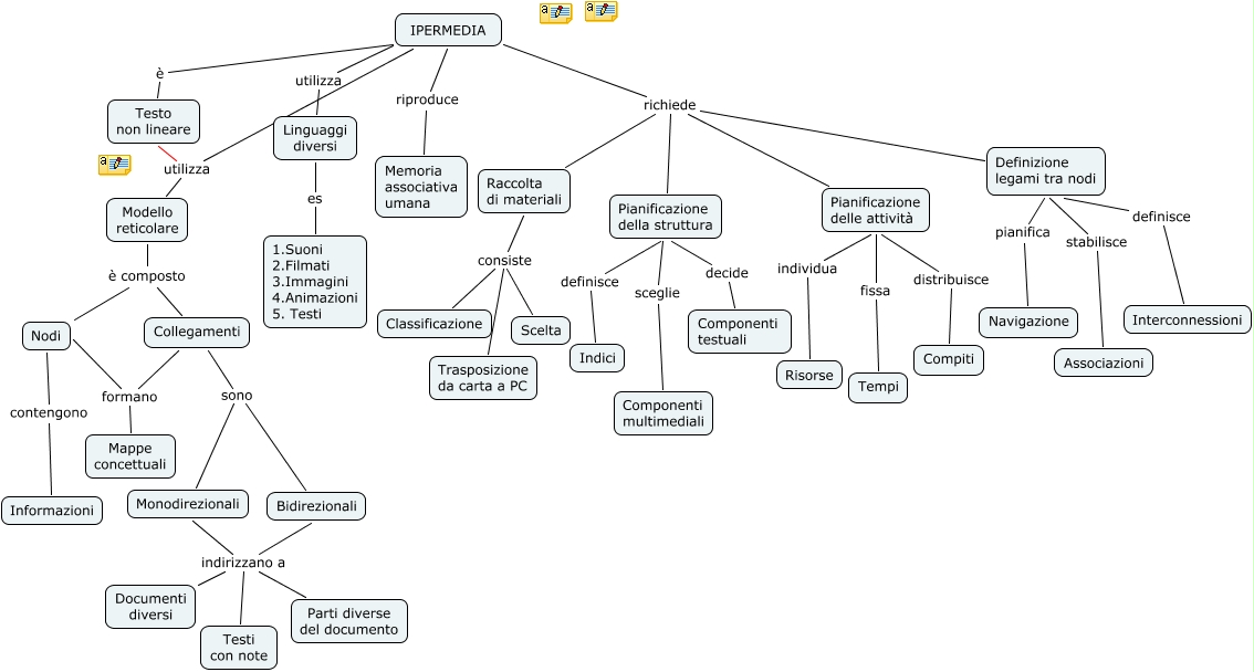 Ipermedia, 1.Suoni 2.Filmati 3.Immagini 4.Animazioni 5. Testi es Linguaggi diversi, Definizione legami tra nodi richiede IPERMEDIA, Pianificazione della struttura richiede IPERMEDIA, Parti diverse del documento indirizzano a Monodirezionali, Raccolta di materiali richiede IPERMEDIA, Collegamenti è composto Modello reticolare, Associazioni stabilisce Definizione legami tra nodi, Trasposizione da carta a PC consiste Raccolta di materiali, Informazioni contengono Nodi, Testi con note indirizzano a Monodirezionali