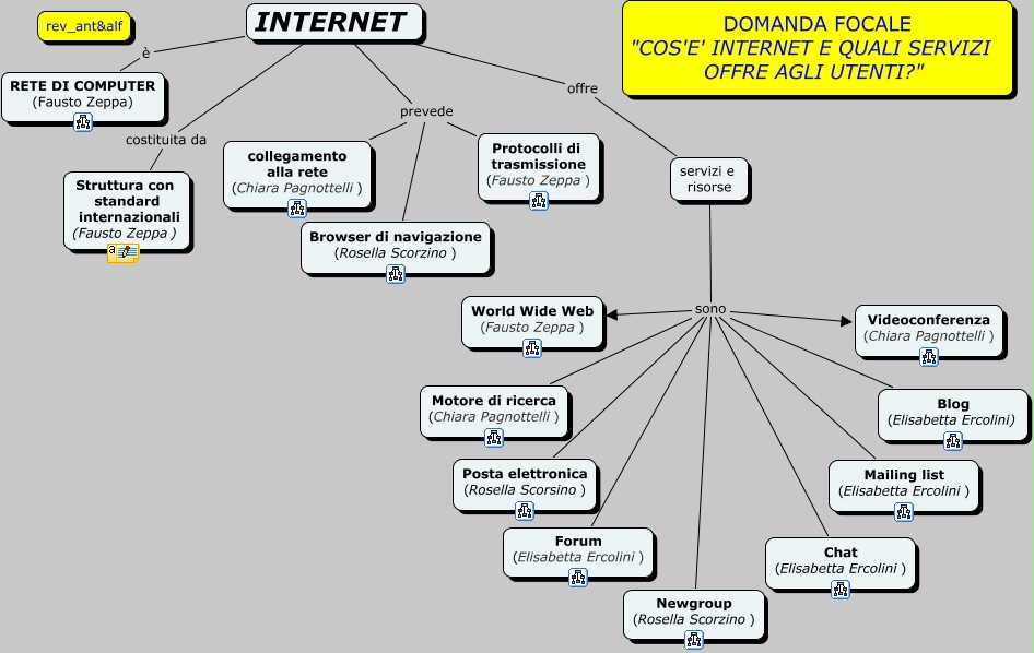 INTERNET (mappa indice), servizi e risorse sono World Wide Web (Fausto Zeppa), INTERNET offre servizi e risorse, servizi e risorse sono Posta elettronica (Rosella Scorsino), INTERNET costituita da Struttura con standard internazionali (Fausto Zeppa), servizi e risorse sono Mailing list (Elisabetta Ercolini), servizi e risorse sono Blog (Elisabetta Ercolini), servizi e risorse sono Videoconferenza (Chiara Pagnottelli), servizi e risorse sono Newgroup (Rosella Scorzino), INTERNET prevede Protocolli di trasmissione (Fausto Zeppa), servizi e risorse sono Chat (Elisabetta Ercolini)