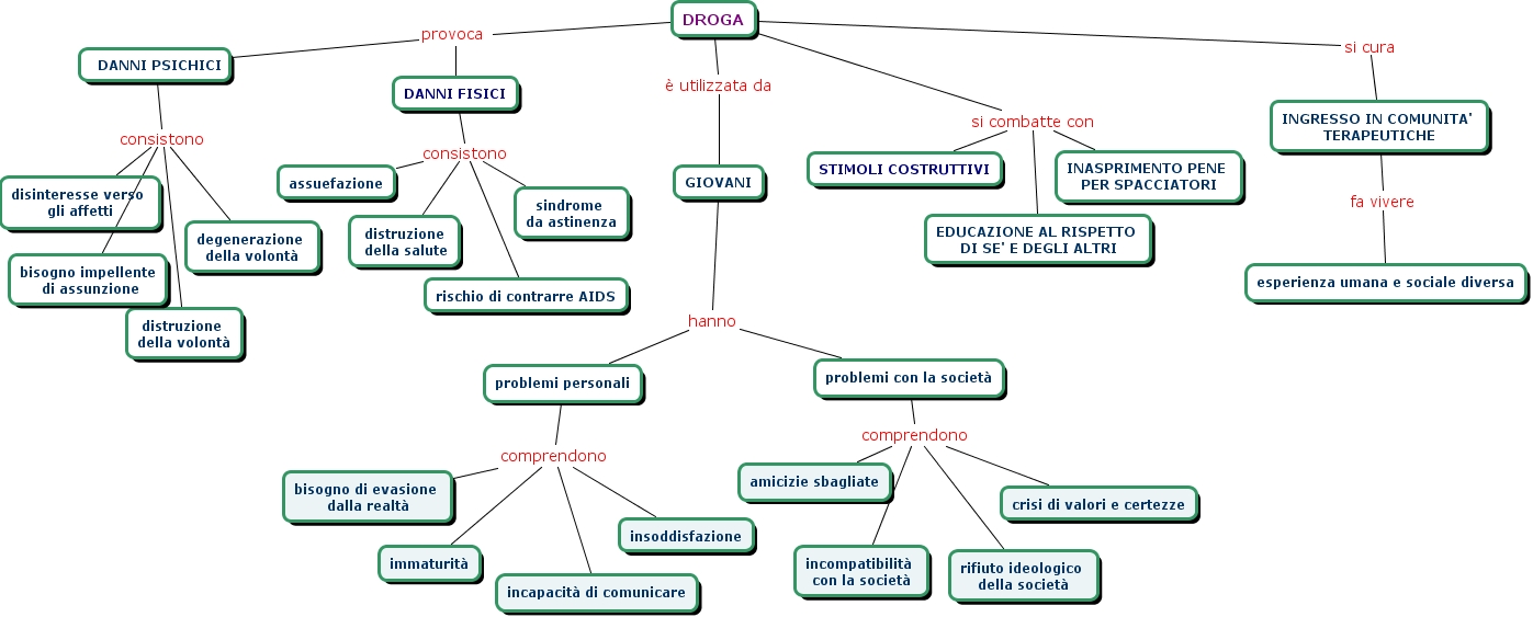 DROGA_REV1_ruggiero, problemi con la società comprendono crisi di valori e certezze, problemi personali comprendono immaturità, DANNI PSICHICI consistono degenerazione della volontà, DANNI FISICI consistono rischio di contrarre AIDS, GIOVANI hanno problemi con la società, DROGA si combatte con INASPRIMENTO PENE PER SPACCIATORI, problemi con la società comprendono rifiuto ideologico della società, GIOVANI hanno problemi personali, problemi con la società comprendono amicizie sbagliate, problemi con la società comprendono incompatibilità con la società