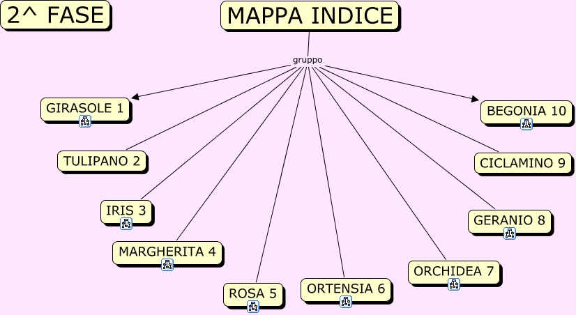 Mappa Indice 2^ fase, MAPPA INDICE gruppo BEGONIA 10, MAPPA INDICE gruppo IRIS 3, MAPPA INDICE gruppo ROSA 5, MAPPA INDICE gruppo ORTENSIA 6, MAPPA INDICE gruppo GIRASOLE 1, MAPPA INDICE gruppo MARGHERITA 4, MAPPA INDICE gruppo TULIPANO 2, MAPPA INDICE gruppo ORCHIDEA 7, MAPPA INDICE gruppo CICLAMINO 9, MAPPA INDICE gruppo GERANIO 8