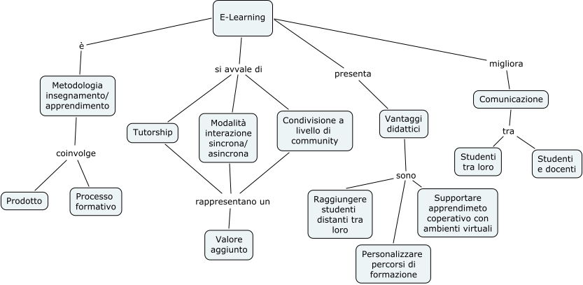 E-Learning, Studenti tra loro tra Comunicazione, Condivisione a livello di community rappresentano un Valore aggiunto, Comunicazione migliora E-Learning, Studenti e docenti tra Comunicazione, Vantaggi didattici sono Personalizzare percorsi di formazione, Prodotto coinvolge Metodologia insegnamento/ apprendimento, Processo formativo coinvolge Metodologia insegnamento/ apprendimento, Modalità interazione sincrona/ asincrona rappresentano un Valore aggiunto, Tutorship si avvale di E-Learning, Vantaggi didattici sono Supportare apprendimeto coperativo con ambienti virtuali